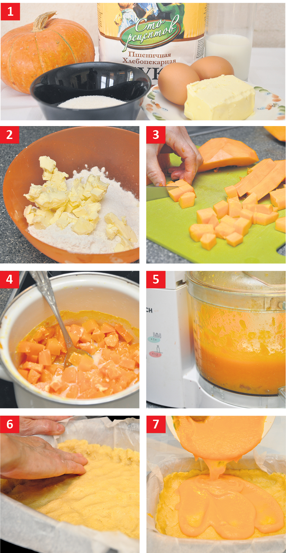 Приготовьте начинку. Тыкву очистите от семян и кожуры, отмерьте 500 г, нарежьте кубиками и сложите в кастрюлю. Добавьте 100 г сахара, молоко, доведите до кипения и варите 30 минут на слабом огне под крышкой, изредка помешивая. Затем взбейте блендером (или в комбайне) до однородности. Остудите, добавьте яйцо и взбейте массу еще раз. Начинка готова.